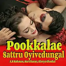 "Pookkalae Sattru Oyivedungal" (Tamil script: பூக்களே சற்று ஓய்வெடுங்கள், transl. Oh flowers... Rest a while) is a romantic Tamil song from the 2015 Tamil film, I. Composed by A. R. Rahman, the song is sung by Shreya Ghoshal and Haricharan, with lyrics penned by Madhan Karky.[1] The music video of the track features actors Vikram and Amy Jackson.[2] The song was re-dubbed in two other languages. The Hindi version of the song "Tu Chale", sung by Arijit Singh and Ghoshal is written by Irshad Kamil while the Telugu version of the song "Poolane Kunukeyamantaa" was sung by Haricharan and Ghoshal and the lyrics for the version is penned by Ananta Sriram. The music video of the song was shot in several locations of China.