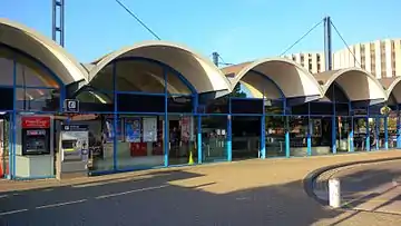 The original New Poole station buildings were built on the London-bound platform, close to the site of Towngate Bridge which replaced a level crossing in 1971. Following the opening of the Bournemouth Direct Railway line via Sway in 1888, the platforms' direction of travel was reversed. The Victorian buildings were replaced by a British Rail prefabricated structure on the other side of the line in the 1970s. This was replaced by the current station building built in the late 1980s. In 2004 proposals were drawn up for the current station buildings and footbridge to be replaced as part of redevelopment plans for the old goods yard. A hotel was to be built on the site of the current station building, however as of 2010 these plans have not progressed.[2]