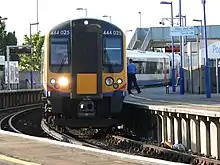 Until 1967, trains through Poole were normally steam hauled. Between 1967 and 1988, passenger services on the London Waterloo-Weymouth line were normally provided by Class 33/1 diesel locomotives with Class 438 coaching stock (also known as 4-TC units). The line through Poole was electrified in 1988, using the standard British Rail Southern Region direct current third rail at 750 volts. Class 442 electric multiple units were initially used following electrification, until being displaced by new Class 444 electric multiple units in 2007. Nowadays, a mix of Class 444 and Class 450 units are in use.
