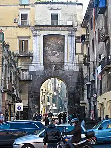 The Gate houses a small chapel, and the northern approach has a restored fresco (1656) belonging to Mattia Preti, the sole remainder of frescoes he painted at seven town gates, this one depicting San Gennaro and Francis Xavier showing devotion to the Immaculata and Child as an ex voto to spare the town from the plague. The southern approach has a Bust of San Gaetano (1659) by Bartolomeo Mori placed by members of the Theatine order. The inside gate, adjacent to an aedicule of the Virgin, has a small chapel-church, San Francesco dei Cocchieri, now deconsecrated and shuttered.[2] 40°51′18″N 14°15′22″E / 40.855121°N 14.256151°E / 40.855121; 14.256151
