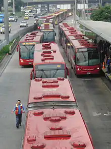 Rush hour on the TransMilenio BRT system at Portal Norte, Bogotá, Colombia. A marshall tries to clear the offside lane while buses queue out of sight.