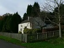 On the northern side of Porthkerry Park there was a small hamlet named Cwmciddy (meaning Valley of the Black Dog in Welsh). It first appeared in the mid 13th century and by 1622 had five houses and several farm buildings, but by 1812, only three cottages and a farmhouse remained. The cottages were demolished in the 1840s by the Romilly family when Porthkerry Park was landscaped.[9] The name - although slightly anglicised - lives on in the area, in the form of a nearby public house, The Cwm Ciddy but its name was changed to the Toby Carvery by 2010 and adjoins a Travelodge hotel. An area of the park known as Cwm Barry, along the main approach road, was used for farming and contains a woodland of about 1.3 hectares with hawthorn, blackthorn, hazel, ash and sycamore trees alongside Barry Brook. The brook flows into a pond at Fishponds Hill bottom, near the only vehicular access road.[13] Cwm Barry Cottage was built in around 1845 to house the park ranger but was demolished in 1972; all that remained was a low boundary wall and fruit trees in the woodland which were once part of the cottage garden but no evidence of this now exists.[8] A mill race used to tee in with Barry Brook just north of that cottage and fed the former wood mill in the Millwood. That mill was driven by an overshot mill wheel which was also fed from a millpond and dam and race placed upstream in the Nant Talwg brook. On an unknown date after the mill became redundant, the dam was dynamited, the bulk of which is to be seen from the Mill Wood bridleway, as a massive concrete mass lying on its side. The country park is now managed by the Vale of Glamorgan Council and a Ranger's office and maintenance vehicle site is located at Nightingale Cottage halfway into the park. The included picture of Nightingale cottage, the Ranger's office, on this subject, shows a surrounding fence. This fence does not now exist (2020) and the area us now heavily CCTV monitored.