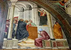A number of the surfaces have been painted in fresco in the Lombardy manner by Vincenzo Foppa. In the pendentives supporting the dome are tondi with the Doctors of the Church while on the side walls are four Scenes from the life of St. Peter of Verona. Above the arch which marks the entrance to the apse is an Annunciation and, facing it above the arch which forms the entrance to the chapel, an Assumption of the Virgin. The frescos were rediscovered in 1878 and restored at the beginning of the twentieth century.[9]