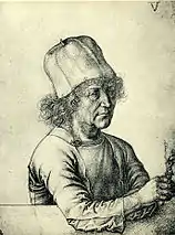 The three-quarter view was widely used in southern German portraiture of the late-15th century. Rosary beads were often included to indicate the piety and modesty of the sitters, although by the 16th century religious motifs and sentiments like this were falling out of fashion. Dürer distinguishes himself from his contemporaries through his tight and detailed focus on his parents' faces, a technique that draws comparison to the work of the first generation of Early Netherlandish painters active 50 years earlier. Albrecht the Elder had travelled to Flanders and from working with Netherlandish artists had acquired a strong appreciation for the work of both Jan van Eyck and Rogier van der Weyden.[8] That he passed on this influence to his son is evident from the early use of silverpoint, a medium which according to Erwin Panofsky requires "an exceptional degree of confidence, accuracy and sensitive feeling for its successful handling".[9]