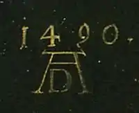 The father panel is signed and dated on both sides, in what may be the oldest extant instance of Dürer's signature monogram of a large open A and small d.[26] However this inscription and the 1490 date are later additions.[35][36] The Florence canvas is in relatively poor condition: retouching has largely removed Dürer's top layer of brushwork and left the paint hard and dry.[26] Barbara's panel underwent a restoration in 1974, when the surface was cleaned and partially revarnished, with repairs to damage on the reverse sustained from woodboring.[7]