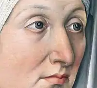 Barbara is shown wearing a red dress and a matte white bonnet which fully covers her hair, indicating her marital status.[14] Her headdress is draped with a long scarf or train which stretches down her neck and across her left shoulder, contrasting in colour and shape against the black headwear of her husband. The lines of her face contain touches of white paint to give a highlighting and enlivening effect; they are especially evident around her eyes, the bridge of her nose and around her upper lip.[17] Barbara was attractive in her youth; her son described her as having been "comely and of erect bearing".[24][upper-alpha 4] However, by the time of this portrait the effects of time and losing so many children weigh heavily on her face.[13] The panel was grounded with white paint, while the composition seems to have changed significantly from the imprimatura. Faint traces of the original figuration are visible in parts of the background and in the darkened areas of her hood.[7] At some point the panel was cut down at the left side, shifting the compositional balance and removing a portion of her shoulder and headdress.[13]