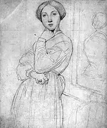 Ever contrary, Ingres later complained that he was unhappy with de Broglie's final portrait, and that he had failed to fully capture her charms.[2] He was relieved when the portrait was met with approval from her family, writing that "family, friends, and above all the loving father [the duc de Broglie] were delighted with it. Finally to crown the work, M. Thiers —and I was not present—came to see it with the subject and repeated to her several times this wicked remark, 'M Ingres must be in love with you to have painted you that way.' But all this does not make me proud, and I do not feel that I have conveyed all the graces of that charming model."[6]