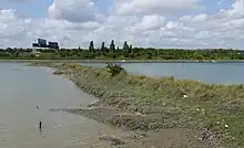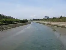 The waterway was made navigable by the Portsmouth & Arundel Navigation company in 1830 after the failure of the Portsea Canal.[6] The work to deepen the creek cost £1000.[7] It proved difficult to keep the creek clear for navigation and a canal called the Cosham Canal to provide an alternative route was proposed, although it was never built.[8] The canal company abandoned the creek in 1838.[6] An army report on the status of the Hilsea Lines made in 1853 mentioned that the creek was filled with weeds to the point where for 3 to 4 hours every day it could be walked across.[9] Later in the decade as part of upgrade works on the Hilsea Lines, the creek was widened and deepened to allow it to be used by gunboats.[10] Dams and flood gates were constructed at the ends of the creek to allow it to be kept it in water at all stages of the tide.[11] The remains of one of these dams can be seen at the eastern end of the creek.[11]