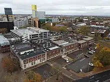 Until the early 1960s, criminal court hearings in Portsmouth were held in the courtroom in Portsmouth Guildhall.[1][2] This was temporarily resolved when a new law courts building (now referred to as Portsmouth Magistrates' Court) was opened on the east side of a small courtyard off Winston Churchill Avenue in July 1960.[3] However, as the number of court cases in Portsmouth grew, it became necessary to commission a courthouse with dedicated facilities for both Crown Court hearings, which require courtrooms suitable for trial by jury, and for County Court hearings. The site selected by the Lord Chancellor's Department, on the west side of the courtyard, had accommodated a series of rows of terraced housing (Swan Street, Russell Street and Upper Swan Street) which had been destroyed by German bombing during the Second World War.[4][5]