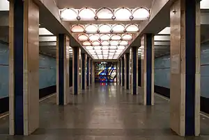 Poshtova Ploshcha (Ukrainian: Поштова площа, ⓘ) is a station on Kyiv Metro's Obolonsko–Teremkivska Line. The station was opened on 17 December 1976, and is named after Kyiv's Poshtova Square (Post Square) near the Dnieper's embankment in the historic Podil neighbourhood. It was designed by A.S. Krushynskyi, T.A. Tselykovska, I.L. Maslenkov, and V.S. Bohdanovskyi.