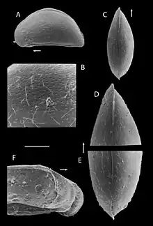 The carapace of P. mastigophora is laterally compressed, with length ranging from 0.55 to 0.64 mm.[2] The left valve bears wide anterior and posterior flanges. The second antennae carry swimming setae that extend beyond the tips of the terminal claws. The males are unknown, all known populations reproducing through parthenogenesis.