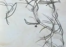 Potamogeton foliosus is a perennial herb growing from a dense, mat-forming rhizome that anchors in wet substrate. It produces a thin, compressed, multibranched stem growing to a maximum length around 75 centimeters. The delicate, hairlike leaves are up to 10 centimeters long. They are pale green to olive green or reddish in color. The inflorescence is a small cluster or spike of flowers arising from the water on a short peduncle. Turions are sometimes present.[4][3]