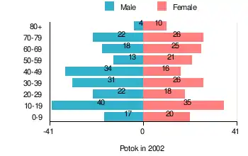 According to the 2002 Poland census, there were 398 people residing in Potok village, of whom 50.5% were male and 49.5% were female. In the village, the population was spread out, with 25.9% under the age of 18, 33.2% from 18 to 44, 17.1% from 45 to 64, and 23.9% who were 65 years of age or older.[1]