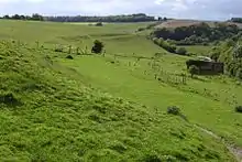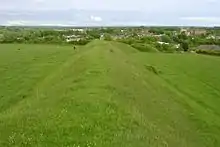 Further buildings and enclosures of the 5th-8th centuries overlie the Roman cemetery.[1] It is roughly rectangular and it is likely that it was designed to command views over the River Frome and the Frome valley to the north. The main entrance to the fort is on the eastern end. It overlooks the county town of Dorchester, Dorset, England.