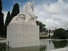 Between 23 June and 2 December 1940, Lisbon realized the Exposição do Mundo Português (Portuguese World Exposition), that included an urbanization plan that encompassed the area of Belém, that included the Praça do Império.[1] The sculptures of the seahorses, that dominate the site, were completed by sculptor António Duarte were installed in 1940.[1]
