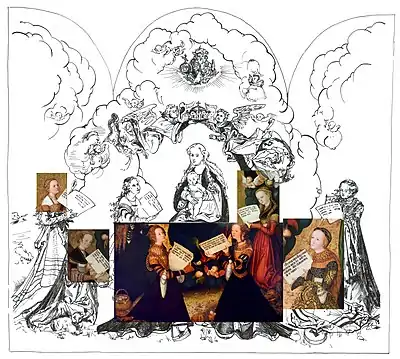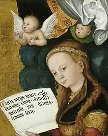 - ↑ Cranach digital archive: '[Ch]risti virgo dilectissima . virtutu[m] [o]peratrix . Opem fer miseris . Subveni d[omi]na . Clamantibus . Ad te iugiter'