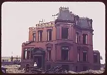 Many of South Michigan Avenue's elegant villas were destroyed in the Great Chicago Fire of 1871.[13] The post-fire South Side of Chicago grew rapidly as all economic classes left the city's center. Many of Chicago's elite families settled along Prairie Avenue. By the 1870s and 1880s, Prairie Avenue was the location of elaborate houses between 16th Street and 22nd Street (now Cermak Road).[14] In 1886, the urban elite, including George Pullman, Marshall Field, Philip Armour and John B. Sherman all owned family homes in this area that created an opulent Prairie Avenue streetscape reminiscent of European city streets;[13] as such, it was widely regarded as the city's most fashionable neighborhood. Businesses, such as the Pullman Company, Armour & Company and D.H. Burnham & Company, with ties to Prairie Avenue had national and international reach and impact.[15] Additional grand homes (including many Queen Anne style architecture in the United States and Richardsonian Romanesque) were located on Prairie between 26th and 30th Streets starting in the mid-1880s.[12] The last mansion, a three-story Georgian Revival residence with 21 rooms, was built in the district at 2126 Prairie Avenue in 1905.[5]