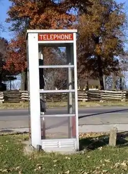 The phone booth is located on the east side of Prairie Grove, opposite the entrance to Prairie Grove Battlefield State Park on U.S. Highway 62,[1] and in front of the Colonial Motel. It is a structure of aluminum with a satin finish, and glass window walls, with a bifold door that folds inward, topped by a red panel marked "TELEPHONE". It rests on a small concrete pad, with the door facing the highway, and measures about 86.125 inches (218.76 cm) in height, and 33.5 inches (85 cm) in width and depth at its base. It is slightly larger at the top, with an aluminum roof that projects slightly beyond the walls. The interior of the booth houses an aluminum shelf, above which the original telephone is mounted. A swiveling directory holder is mounted in the shelf, and there is a fluorescent light fixture mounted in the ceiling.[4]