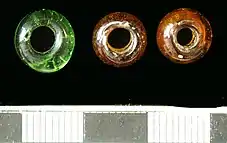 There are three main compositional groups for these glass beads which can help distinguish them from one another; lead-potash glass, mineral soda-alumina glass, and a newly identified high-alumina glass. Lead-potash glass contains high concentration of lead and higher levels of potash in comparison to the others. The production of lead-potash glass beads is believed to have started in China during the sixth century specifically used in the Ming Dynasty. The colors found at these sites in this distinct type of glass bead are white, polychrome blue, opaque blue, red-orange opaque, transparent purple, ruby red, and opaque yellow. These Cambodian bead share similarities with beads found in the Philippines once again validating bead exchanges or technological movement between South-east Asian populations. High alumina mineral soda glass is identified by its low magnesia concentration, and has also been discovered on the eastern and southeastern coast of Africa, suggesting there may have been production centres on the west coast of India, possibly for export to Africa. The variety of colors these beads were produced in include, light and dark blues, opaque black, opaque yellow, opaque red and opaque green.[3]