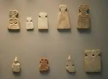 Symbolic representations of birds of prey are found in polished stone, especially at Nemrik,[65] carved at the end of stone rods (probably pestles).[66] These birds of prey are related to the Zawi Chemi bone deposit discovered in 1960 and studied by Rose Solecki. They bear witness to an original local cult and could support the hypothesis of the use of falconry.[58] The skeleton of an individual was found in a burnt-out house, his arms apparently extended towards one of these bird heads.[67] Other animals are modeled in clay, carved or engraved on stone vases: wild boars, snakes, lions, and foxes at Hallan Çemi in southeastern Anatolia. Human figures were also made. The wild ox, though occasionally hunted, is nowhere to be seen except[68] in Hallan Çemi: one house contains the skull and horns of a wild aurochs, which were once hung on the wall.[69] The subjects are similar to those of objects from Mureybet in Syria and Cafer Höyük in Turkey. Other objects found at Nemrik include stone pendants of various shapes, malachite beads, stone representations of sexual organs, and river shell ornaments.[70]