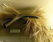 Like Nemrik, the early levels of Tell Maghzaliyah show a predominance of obsidian, despite the remoteness of the nearest deposits in Anatolia, from where the chipping technique was imported. The site also contains projectile points, both leaf-shaped and knives, as well as clockwise rotating drills. Tell Sabi Abyad II, Byblos, and Amuq points were found in the upper levels of a site in the Belikh Valley. Flint scrapers, later used during the Hassuna period, are already present. Bitumen-coated sickles have also been found at Tell Maghzaliyah and other villages in the Belikh Valley, the blades of which show traces of grain harvesting. The inhabitants also left behind marble bowls, bracelets, and polished punches. Although the village of Tell Maghzaliyah is still pottery based, plaster tableware and decorated pottery are also used. These can be found throughout Jezirah and the Syrian Desert, especially at Seker al-Aheimar.[58][68]