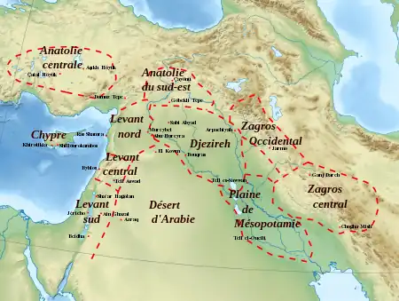 The seasonal villages of Zawi Chemi and Shanidar B1 seem to have given way to the first known sedentary villages in Northern Iraq: M'lefaat, Qermez Dere and Nemrik. These are located at the junction of the Zagros foothills and the Upper Mesopotamian steppe. Most of them were established between the 12th and 10th millennia BC In many ways, they are considered the heirs of the Zarzians. However, their development is not felt until the 9th millennium BC, at the expense of the other cultures associated with the PPNA and PPNB, whose influence they only begin to feel from the 8th millennium BC onwards.[56]
