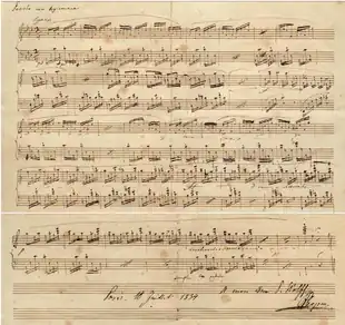 The manuscript, which Chopin carefully prepared for publication, carries a dedication to the German pianist and composer Joseph Christoph Kessler.[3] The French and English editions (Catelin, Wessel) were dedicated to the piano-maker and publisher Camille Pleyel, who had commissioned the work for 2,000 francs (equivalent to nearly $30,000 in present day).[4][5] The German edition (Breitkopf & Härtel) was dedicated to Kessler, who ten years earlier had dedicated his own set of 24 Preludes, Op. 31, to Chopin.