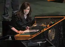 Her administration sought to increase bilateral relations with Angola and Iran. Since there is suspected Iranian involvement in the 1994 AMIA bombing, Kirchner's relations with the Argentine Jewish community deteriorated.[116] Fernández gave her United Nations General Assembly speech where she again criticized Britain over the Falklands (Malvinas) issue, and Iran for the 1994 AMIA bombing while giving her support for an Israeli-Palestinian dialogue and an eventual Palestinian state.[117]