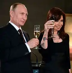 In September 2010, it was announced that Argentina was elected president of the Group of 77+China and prepared to act as a ‘bridge" with G-20 major economies to which it also belongs.[82] She visited Chile during their Bicentenary celebrations where she also assisted at the baptism of a Chilean baby, Anaís Escobar Maldonado, born in the Argentine Hospital deployed at Curico after the earthquake. The visit had a high profile in the media mainly because of the possible extradition to Chile of Sergio Apablaza. She met with president Sebastián Piñera and participated in the festivities at the national stadium.[83] She also confirmed the celebration of the III bi-national cabinet meeting for next October.[84][85] Fernández de Kirchner then departed for New York to give her United Nations General Assembly speech where she once again criticized Britain over the Falklands (Malvinas) issue, and Iran for the 1994 AMIA bombing whilst giving her support for an Israeli-Palestinian dialogue and an eventual Palestinian state.[86] On 30 September she hosted the UNASUR presidents' emergency summit at Buenos Aires due to the Ecuador crisis and started an official visit to Germany the following day in order to participate as a Guest of Honour at the Frankfurt Book Fair[87] and meet with Chancellor Angela Merkel. In October she inaugurates the III News Agencies World Congress to be held in Bariloche.[88] This same month, and as part of the 2006 civilian nuclear-power reactivation program, Fernández reopened the Pilcaniyeu uranium enrichment plant, put on ice in the 1990s, amid worsening shortages of natural gas.[89] Following the death of her spouse (see below), she also resumed activities and flew to South Korea for the G20 Seoul summit. After her return she announces that the Paris Club agrees to debt talks without the International Monetary Fund intervention as proposed by Argentina since 2008. These negotiations will result in the settlement of the last portion of the sovereign debt defaulted in the 2001 crisis after the successful restructuring debts of 2005 and 2009.[90] In November she also participated in the UNASUR Summit at Guyana after which will host the XX Ibero-American Summit at Mar del Plata.