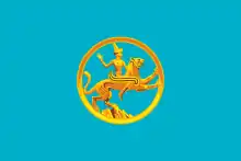 The standard of the president of Kazakhstan is similar to the national flag in that it is rectangular in shape with a ratio of 1:2. In the center of the standard is the emblem of Kazakhstan. It is bordered on three sides with golden fringe.[5][6]