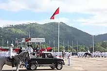 The presidential flag may be flown from a vehicle in which the president is travelling, or from a building in which the president is present or is residing. The flag in its present form was adopted in 1976 and is a blue field with the Trinidad and Tobago coat of arms surrounded by 11 petos on each side. It takes precedence over the national flag. The national flag is generally employed when the president undertakes a state visit abroad or on a national celebration. The national flag is also flown at half-mast upon the death of an incumbent or former president.
