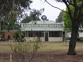 Pretty Pine was the first stopping-place for passenger coaches travelling from Deniliquin to Hay. In an account of such a journey, published in 1888, the writer commented that at Pretty Pine "there is a native pine tree carefully fenced, from which the little inn takes its name".[23] In 1889 the Pretty Pine Hotel was described as a "commodious" hotel with "all necessary out buildings", including stables for twenty horses, stock-yards, tanks and wells. The property was attached to eight acres of freehold land and a leased paddock of 320 acres of Crown land.[24]
