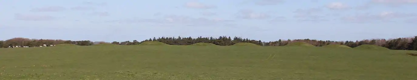 Ashen Hill Barrow Cemetery is the most northerly of the sites and consists of six bowl barrows and two bell barrows aligned east to west,[2] although :Lewes suggests that three may be bell barrows.[6] Each of the mounds is between 14 metres (46 ft) and 20 metres (66 ft) in diameter and rising to between 2 metres (6 ft 7 in) and 3 metres (9.8 ft) high. Each is surrounded by a ditch which has become infilled over time.[2] To the north and east of the barrows are further signs of excavations but these were related to lead extraction.