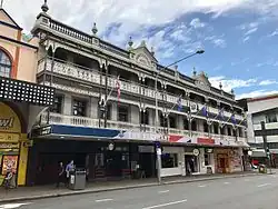 The principal range along Wickham Street is rendered to resemble ashlar. It has balconies to the two upper floors with cast iron twin posts, and balustrades and friezes of differing designs to each floor. The upper balcony has a curved galvanised iron roof below a corbelled and bracketed string course, a rendered parapet with two triangular pediments, and concrete balusters and urns. French doors with fanlights, between pilasters, open onto the balconies. Changes to the street elevation have been confined to the ground floor shopfronts and the replacement of the original curved, post-supported awning with a flat cantilevered awning.[1]