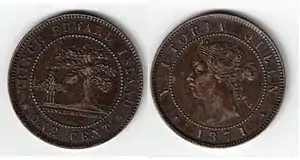 Only one type of coin, the one-cent piece, was struck for the Prince Edward Island dollar, in 1871. PEI entered Confederation two years later. Both sides of the coin were designed by Leonard Charles Wyon. The obverse had Queen Victoria, with inscription "VICTORIA QUEEN" and the date. The reverse was specially made for the PEI government, showing the seal of the colonya large oak tree, symbolising England, sheltering three younger ones, which symbolised Prince Edward Island's three counties. Below the seal was located the Latin phrase "PARVA SUB INGENTI", translated as "The small beneath the great". Around the seal and phrase was written "PRINCE EDWARD ISLAND", and the denomination, "ONE CENT". The coin was produced at the Heaton Mint, due to the London Mint having to strike domestic coins. However, the "H" mint mark is missing. The coin is composed of 95% copper. 4% tin, and 1% zinc. It has a weight of 5.67 grams and a diameter of 25.40 mm. It has a plain edge, and a coin orientation. Two million one-cent pieces were minted. PEI's government would experience difficulties in placing the coins in circulation10 years were needed for the government to get rid of them. The last of the coins were sold at a 10 percent discount.[1]