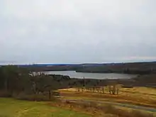 View of a portion of the lake and surrounding woodlands from the observation deck on top of a water tower.
