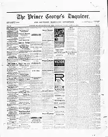 The Prince George's Enquirer and Southern Maryland Advertiser was a weekly newspaper published from 1882 to January 30, 1925, in Upper Marlboro, Maryland.[1] It replaced a paper that had been established during the American Civil War by Michael J. Slayman, The Prince Georgian and Southern Maryland Advertiser.[2] The Enquirer was founded by Joseph K. Roberts and Frederick Sasscer, Jr., both politically well-connected lawyers from Upper Marlboro. Roberts died in 1888, but Sasscer continued to edit the paper and eventually became its owner, solidifying the paper's political stance as staunchly Democratic. In 1909, an apprentice working for the paper, Samuel A. Wyvill, became part owner.[3] Together, Sasscer and Wyvill bought the Marlboro Gazette from Mary and Charles Wilson on January 30, 1925, and named the new merged paper The Enquirer-Gazette.[4][5] Frederick Sasscer remained editor until his death in 1929.[6] The Enquirer-Gazette continues to publish issues to this day.[7]