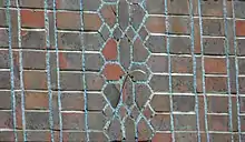 The five-storey building has elevations facing south (on to North Street; five bays), west (with 11 bays facing Prince's Place) and north (six bays facing the Royal Pavilion Gardens). The structure of the steel frame is emphasised by being overlaid with handmade bricks in a soldier course pattern both horizontally and vertically. At each join, the brickwork is laid in a starburst pattern, and pieces of blue tile and glass are inlaid into the joints between the bricks.[3] Green slate is used as a sheathing material at ground-floor level on the rear elevation.[1][3] Between each section of steel framing, each bay is treated identically in the form of "a cell of identical dimensions and design", consisting of a full-width steel casement window (those at first-floor level slightly taller than those above them) above a panel of red bricks laid in the header bond pattern. The top storey is expressed differently, with single or double pairs of narrow windows alternating with larger, slightly projecting windows in the style of a shallow bay window. The whole of the top storey is also set forwards slightly. Above this, a parapet runs around the whole roof except at the southwest corner, where there is a tower in the form of a short cylinder with zig-zag walls. This zig-zag effect is carried on down the whole of the southwest corner, where the windows have this layout and are slightly recessed.[3][11]