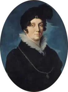 During her visits in Russia and Sweden she made attempts to reconcile her sons-in-law, the Russian and Swedish monarchs with each other.[4] In 1803, she received the royal Swedish family as guests in Baden, during which it was said that she had the chance to gain influence over her son-in-law, as she was lovable and amusing, had a lively interest in politics and the same views as him.[5] It was said of Amalie that: "The Landgravine of Baden could in power hunger and will force measure up to that of Catherine II".[5] As an opponent of Napoleon Bonaparte, she had tried to prevent the wedding of her son to Stéphanie de Beauharnais, and after their wedding in 1806, she retired to her widow estate at Schloss Bruchsal in the Kraichgau. In 1807, Amalie sent her daughter, Queen Frederica of Sweden, a letter from her second daughter, the Empress of Russia, in an attempt to convince Frederica to use her influence to persuade her spouse to make peace between Sweden and Napoleon, which did not succeed.[6][7]