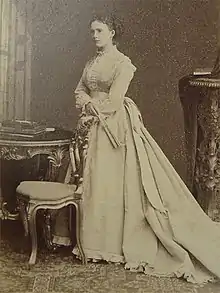 Princess Eugenia of Leuchtenberg was born on 1 April [O.S. 20 March] 1845 at the Mariinskiy Palace in Saint Petersburg.[3] She was the fourth child and third daughter of Maximilian de Beauharnais, 3rd Duke of Leuchtenberg and his wife, Grand Duchess Maria Nikolaevna of Russia. Eugenia's father, Maximilian, Duke of Leuchtenberg, had traveled to St. Petersburg, eventually winning the hand of Grand Duchess Maria Nikolaevna, Nicholas I's eldest daughter. Maximilian was subsequently bestowed with the style Imperial Highness and given the title Prince Romanowsky.[4] As the daughter of a Russian grand duchess and an ennobled Russian prince, Eugenia and her siblings were always treated as grand dukes and duchesses, bearing the styles Imperial Highness.[5][6][7]