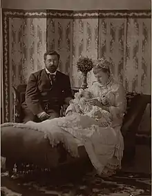 Louise had been kept away from the matrimonial negotiations concerning her. However, once informed of her inminent engagement, she remembered favorably her future husband, fourteen years her senior, glimpsed during his visits to Brussels and that if they had said insignificant things to each other, she had the impression of "know him well, and have always been".[21] She was looking forward to getting married. The betrothal, celebrated on 25 March 1874,[22] lasted for a year because Louise had not reached yet a marriageable age and because both bride and groom were closely related a papal dispensation was required. After financial negotiations (King Leopold II wished to spend as little as possible), the wedding was concluded at the Royal Palace of Brussels on 4 February 1875.[23]