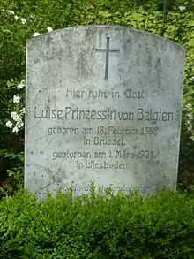 In February 1924, Louise suffered from acute circulatory problems suddenly aggravated by a double congestion.[90] In the early afternoon of Saturday 1 March, she received a visit from a friend, Julius Fritz, who noticed that she was dying. Fritz set out to find a priest to administer the last rites to her, but when he returned with the clergyman, the two men could only note Louise's death at 2 p.m. in the afternoon. Three days later, after a very sober funeral ceremony, she was buried in the South Cemetery of Wiesbaden.[91] Absent during the funeral of their relative, the Belgian royal family (who had dispatched their trusted man Baron Auguste Goffinet in their behalf), mourned her for a month.[92]