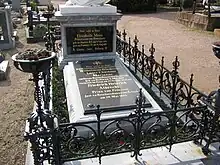 Marianne survived van Rossum by ten years and died in the Schloss Reinhartshausen in Erbach on 29 May 1883, 20 days after her 73rd birthday; as was previously determined by her, she was buried next to her partner in the public cemetery of Erbach.[11] Just as previously commissioned for her son's grave, a work made by the Dutch sculptor Johann Heinrich Stöver was made for van Rossum's grave, a blessing statue of Christ made of Carrara marble, again based on a figure by the Danish sculptor Bertel Thorvaldsen. To this day it adorns the joint grave of Marianne and van Rossum in the Erbach cemetery. The base of the Christ statue with the inscriptions from the Gospel of John, the decorated grave border made of Lahn marble and the grave slab with inscription were made by Josef Leonhard (1833–1901), offspring of the renowned Nassau sculptor dynasty Leonhard from the marble metropolis of Villmar on the Lahn. He was apprenticed to the famous Wiesbaden sculptor Emil Hopfgarten and in 1856 he opened a studio in Eltville am Rhein, which still exists today.
