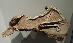 Burrer sent the specimen to Professor Eberhard Fraas of the königliche Stuttgarter Naturalienkabinett. In a lecture on 9 October 1911, Fraas referred to it by the name "Hallopus celerrimus", considering it a jumping form of dinosaur that was approximately 60 cm (2.0 ft) long, and was associated with the origin of birds.[2] Later, Fraas decided to use a different name in the official publication.[3] Fraas in 1913 named the genus Procompsognathus with as type species, Procompsognathus triassicus.[4] The type specimen is housed in the collection of the State Museum of Natural History in Stuttgart, Germany.