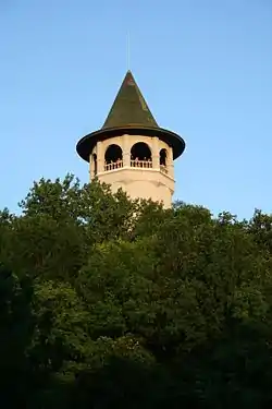The Prospect Park Water Tower, sometimes referred to as the Witch's Hat Water Tower, is a historic water tower in the Prospect Park neighborhood of Minneapolis, Minnesota, United States. It was built in 1913 on Tower Hill Park, a hilltop park established in 1906. The water tower has become the neighborhood's architectural mascot for its singular design by Frederick William Cappelen.[2] The tower is rumored to be the inspiration for Bob Dylan's song "All Along the Watchtower," as the tower was clearly visible from Dylan's home in nearby Dinkytown.[3]