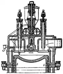 The precombustion chamber patented in 1909 by L'Orange connects to the engine cylinder via a restricted passage, or burner. In operation, a narrow cone of fuel is sprayed down towards the burner by the single orifice injector nozzle. At this time the technology did not exist to manufacture nozzles with multiple orifices and diesels used high pressure air to spray the fuel directly into the cylinder. L'Orange also discovered that indirect injection diesel engines ran more smoothly and quietly than direct injection engines. Use of a precombustion chamber also reduced stress on the engine's structure, so that it could be made less heavy than a direct injection engine. However, indirect injection engines require higher compression ratios, about 20:1, to compensate for the greater surface to volume ratio causing more heat loss from the cylinder charge. They are also more difficult to start when cold, therefore the precombustion chambers are fitted with electrically heated glowplugs.[1]