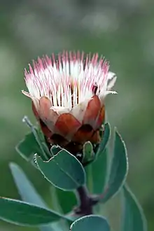 Protea subvestita, the waterlily sugarbush, is a flower bearing shrub that belongs to the well-known genus Protea. The plant is native to Lesotho and South Africa and occurs in Mpumalanga on the escarpment of the Wakkerstroom, Free State, KwaZulu-Natal, Eastern Cape (as far as Somerset East), and the Klein Swartberg. The shrub is large, erect and grows up to 5 m. It flowers mainly from January to March.