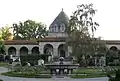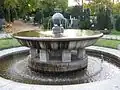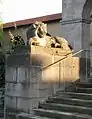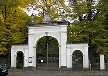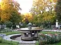 The Evangelical Protestant Central Cemetery in Regensburg was inaugurated on November 2, 1898. It blends the elements of a rural cemetery in a landscaped park-like setting with a monumental Christian cemetery character. The new central cemetery was the successor to two older non-existent Protestant cemeteries, namely the Lazarus cemetery and St. Peter's cemetery, which were both located near the city wall. To establish a new cemetery catering to all Protestant parishes of Regensburg, the Evangelical Lutheran deanery set up a commission that included Julius Pöverlein and Christian Zinstag as architects and appointed Conrad Mayer as a landscape designer. Some additional requirements from the city had to be taken into account, because part of the cemetery land was to be used as a communal municipal cemetery under the control of the city administration in order to bury the non-religious citizens without any church affiliation and serve as a potter's field for found unidentified decedent as well as suicide burials. The mortuary and a prayer hall were built in the Neo-Renaissance style in 1898. Access to the cemetery is from the north via a three-arched portal designed by German Bestelmeyer, with the Biblical inscription “Your dead shall live” (Isaiah 26:19) above the central arch, topped by a large stone cross. The cemetery was consecrated on November 2, 1898 by Rudolf Woldemar Koch, the Lutheran provost General-Superintendent, and the first burial recorded on the cemetery grounds was Luise Hirschmann, the wife of the stonemason Gottfried Hirschmann, who was also involved in the design of the cemetery. In mid-July 1899, an approximately 10 meters long gigantic crucifix was placed on the cemetery ground which was created by the sculptor Anton Hess. The cemetery houses many ornate mausoleums and family chapels, including the impressive Dörnberg mausoleum, built between 1911 and 1914. The mausoleum is characterized by an exterior staircase flanked by resting lions and a high, steep-arched stone dome with shell limestone cladding based on the Byzantine architecture. Above the portal is the coat of arms of the Von Dörnberg family. In the interior, vaulted by a flat dome painted in Art Nouveau style, is the circular crypt with eight burial chambers. The room is decorated with mosaics and a large Caritas figure, as well as a bust of Ernst von Dörnberg.[1] [2] [3]