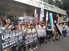 Numerous economic conditions have prompted many groups to stage protests against the administration. Conditions such as poor working situations of farmers and workers, corruption, lack of aid, low wages, high prices, jeepney modernization, maltreatment of health workers, and many more have prompted many groups to protest on many occasions.[13][14]