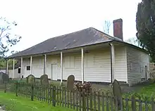 The single-storey building is timber-framed with a weatherboarded exterior resting on a brick plinth. The hipped roof has a brick chimney-stack, is tiled with slate and extends over the front of the building as a seven-bay veranda with wooden pillars.[3][5] The main entrance door is centrally placed and has six panels; there is a four-panelled subsidiary door on the southwest side, and casement windows with original external shutters flank both doors.[1][3][5] There are also two blocked windows on the east side.[3] A path of Charlwood stone leads to the entrance.[5]